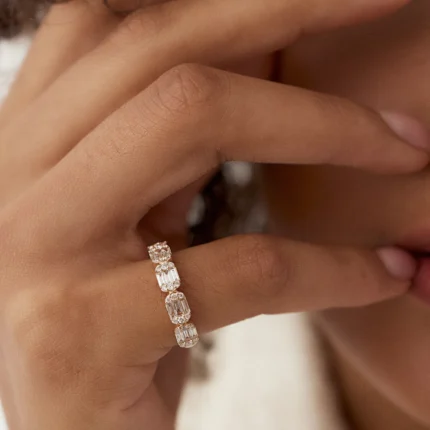 "Elegant 14K Solid Gold Baguette and Round Diamond Full Eternity Ring – a beautiful design with diamonds set all around the band, perfect for a sophisticated, radiant touch."