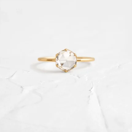 This 18k solid gold ring features a moissanite diamond set in a delicate rose basket design—offering elegant charm and vintage-inspired beauty.