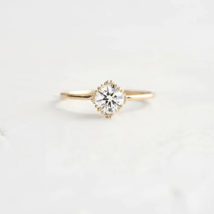 Get this Product in 14K GoldElegant 18k gold halo ring featuring a 0.7ct round-cut moissanite diamond in a modern threaded band. Available in white, rose, and yellow gold. BIS Hallmarked for authenticity.
