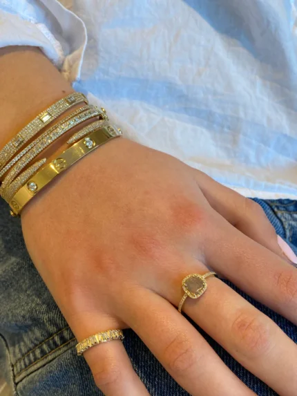 The Petite Pave Diamond Bangle is crafted from 14K solid gold, featuring 138 brilliant diamonds totaling 0.33 CTW with VS-SI clarity and F color.