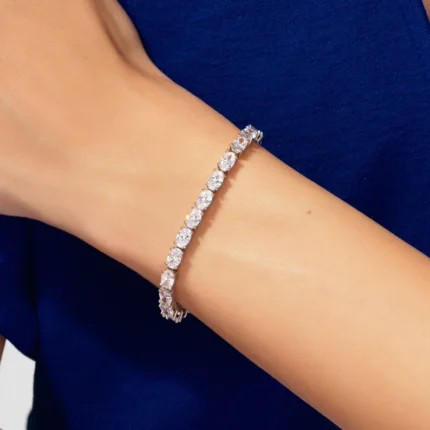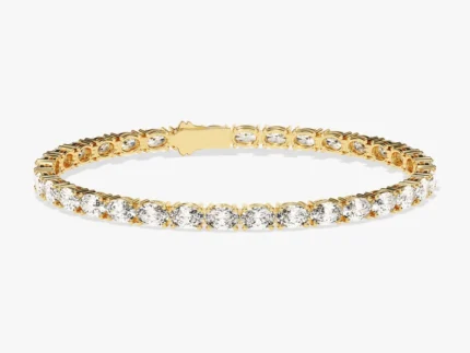 Get this Product in 18K Gold The 14K Solid Gold Diamond Tennis Bracelet for women exudes timeless beauty, featuring oval-shaped diamonds set in prong settings to enhance their brilliance.