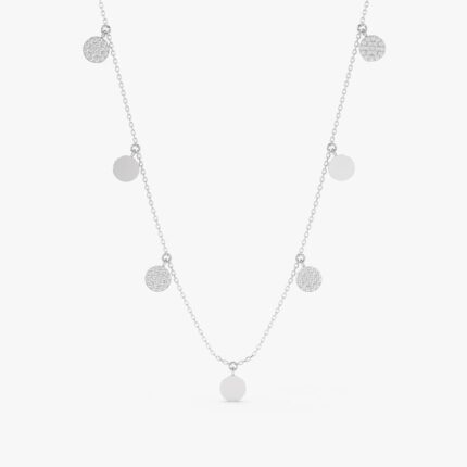 Mixed Coin Drop Necklace: An eye-catching piece, handmade from solid gold, featuring alternating gold disks and diamond pave disks along a delicate chain.