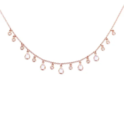 The Moonstone and Natural Diamond Teardrop Necklace is a captivating blend of charm and sophistication. Crafted in 18k solid gold, this necklace features 5 luminous moonstones totaling 0.90 ct, paired with 10 sparkling bezel-set diamonds weighing 0.10 ct.