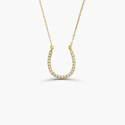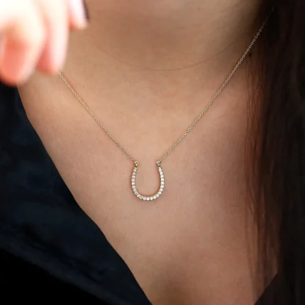 Get this Product in 18K Gold The 14K Natural Diamond Large Horseshoe Necklace is a stunning piece crafted in 14K solid gold, available in white, rose, and yellow gold. It features 23 round diamonds, each 1.2mm in size, for a total carat weight of 0.18 ct.