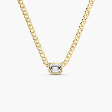 14K Solid Gold Cuban Link Bezel Setting Emerald Cut Diamond Necklace