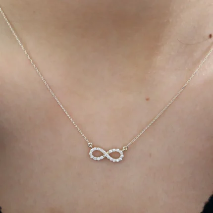 Get this Product in 18K Gold The 14K Gold Natural Diamond Infinity Necklace features 21 round diamonds in a micro-pave setting, offering timeless elegance.