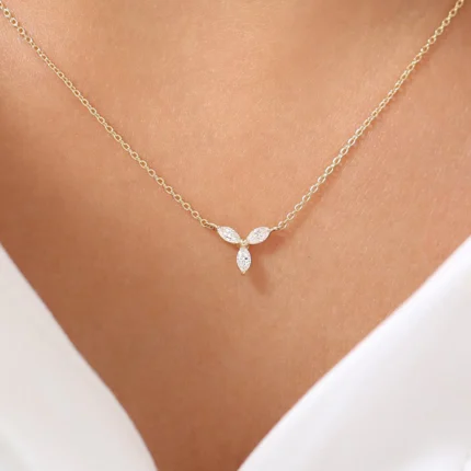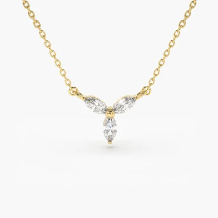 A delicate 14K gold marquise natural diamond cluster necklace, featuring three marquise-cut diamonds and one round diamond (0.16 CTW, G color, SI clarity) in a prong setting. BIS Hallmarked, available in White, Rose, and Yellow Gold.