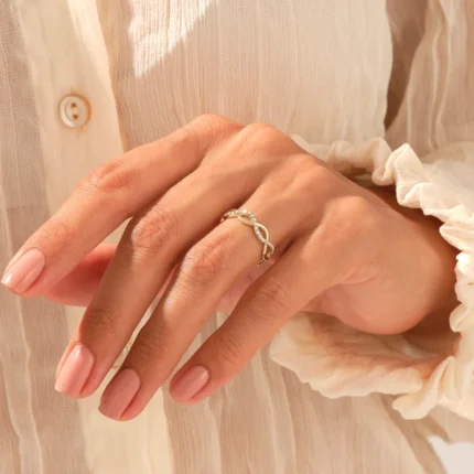 Natural Diamond Twisted Infinity Ring in 14K solid gold (white, rose, yellow). Features 0.22 ctw pave natural diamonds, GH color, VS-SI clarity, GIA & BIS certified. Perfect for stacking or solo wear.