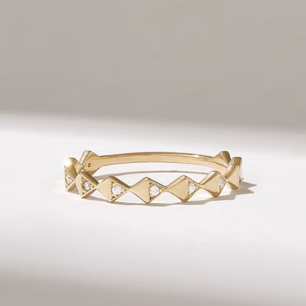 14K solid gold geometric wedding band with 0.05 ctw natural diamonds (GH color, VS-SI clarity, excellent ideal cut). GIA & BIS certified.