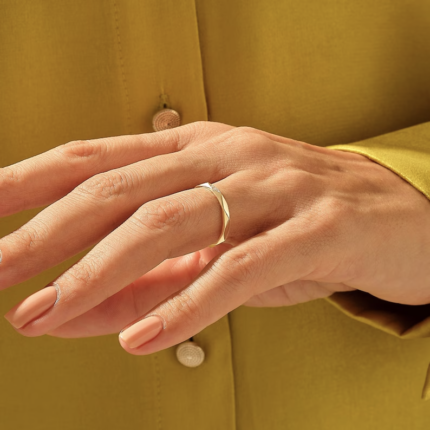 Minimalist 14K gold flat band with one side pave 0.27 Ct natural diamonds (GH COLOR, VS-SI Clarity). BIS & GIA certified.