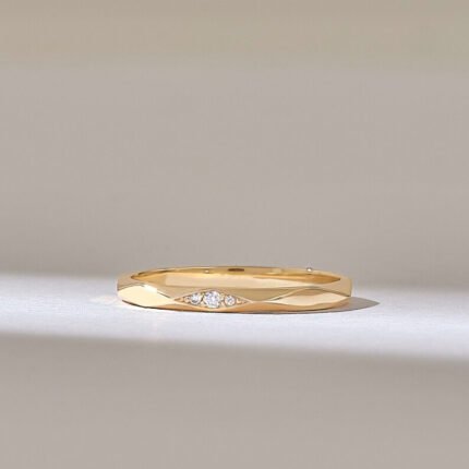 Pave Faceted Band Ring | Ultra Thin Wedding Band 14k Solid Gold | Tiny Natural Diamond