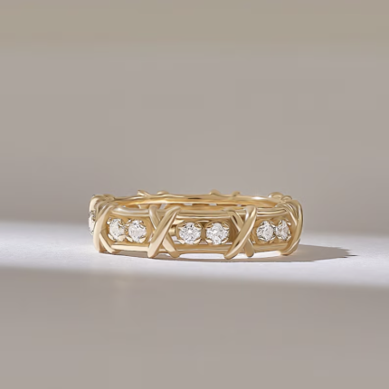The Pave Natural Diamond Cross Wedding Band is a 14K solid gold eternity ring featuring 0.64 ctw of VVS clarity natural diamonds (D-E-F color) in a cross-inspired design. Available in white, rose, or yellow gold.