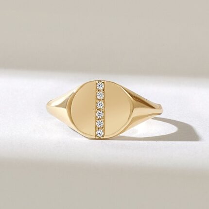 14k gold pinky signet ring with a sleek pave diamond line (0.06ctw, GH color, VS-SI clarity). Square top, minimalist style. BIS & GIA certified.
