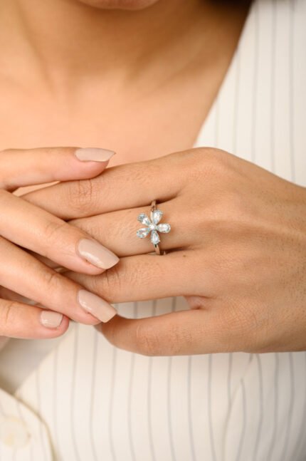 Get this Product in 18K Gold A delicate 14K solid gold ring featuring an aquamarine stone in a dainty floral design, offering an elegant and charming touch to any outfit.