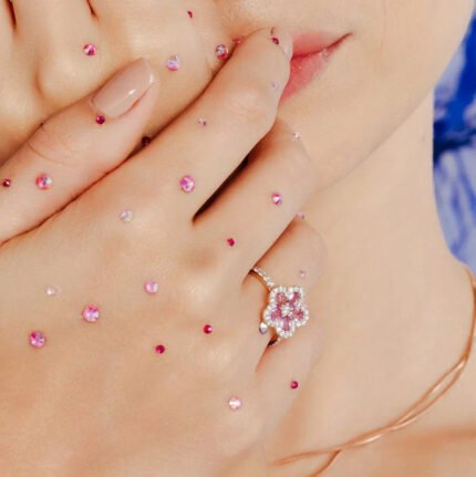 Delicate and charming, this 14K solid gold ring features pink sapphires arranged in a cherry blossom flower design—perfect for romantic elegance.