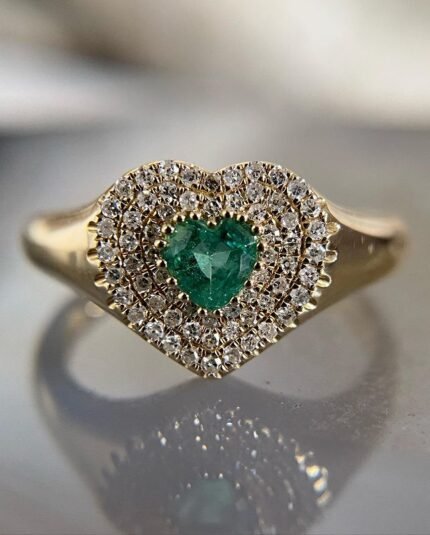 18K Solid Gold Emerald And Diamond Heart Signet Ring