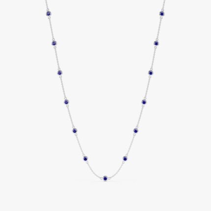 A stunning 18k solid gold necklace featuring multi blue sapphires set in a station design, offering a vibrant and elegant touch to any outfit.