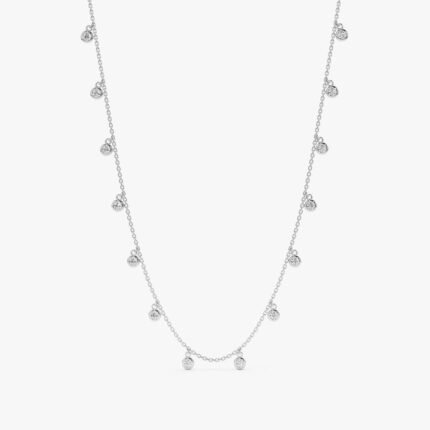 Our Diamond Bezel Station Necklace offers a modern take on elegance, featuring 14 dainty diamond charms set in sleek bezel settings along a solid 18k gold chain.