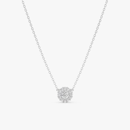 Radiate elegance with our Diamond Halo Pendant Necklace. A round diamond surrounded by a sparkling halo rests delicately on a 18k white gold chain for timeless sophistication.