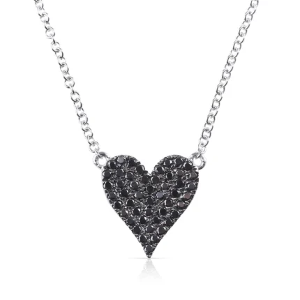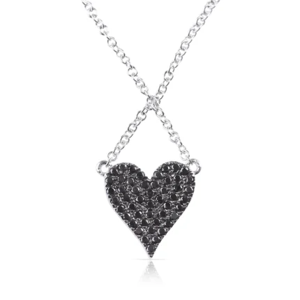 The Reversible White and Black Natural Diamond Heart Necklace features 73 white diamonds (0.16 ct) and 49 black diamonds (0.24 ct) set in a heart-shaped pendant measuring 10 cm in length and width.
