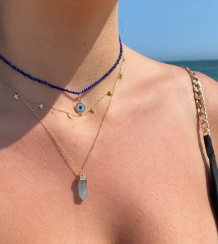 Elegant 18k solid gold necklace featuring aquamarine and diamond crystals—crafted for serene beauty, sparkle, and timeless sophistication.