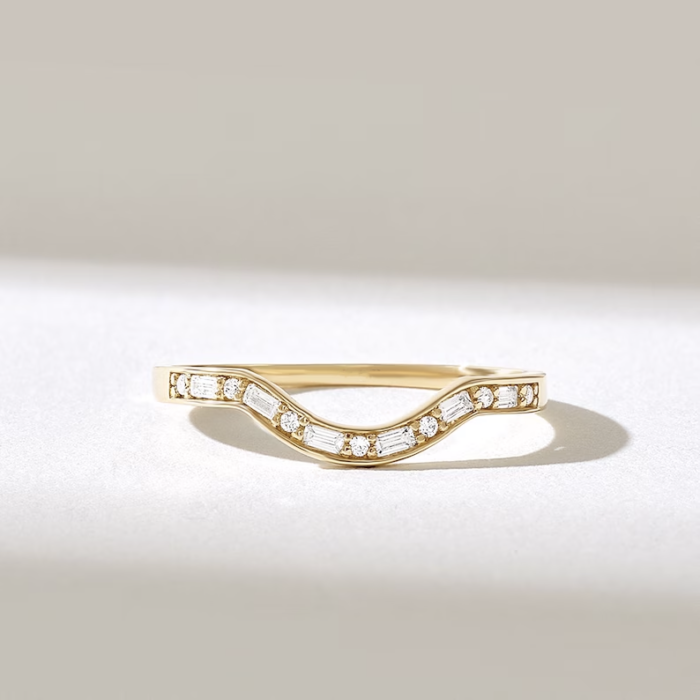 Gracefully designed to accentuate and stack seamlessly, the 14K Arch Curved Ring is a minimalist masterpiece with a refined touch of brilliance. This delicate contour band is crafted from 14K solid gold and features a soft arched silhouette adorned with pave-set natural diamonds. Perfectly shaped to complement engagement rings or to wear alone, it brings a gentle curve and added sparkle to your stack.