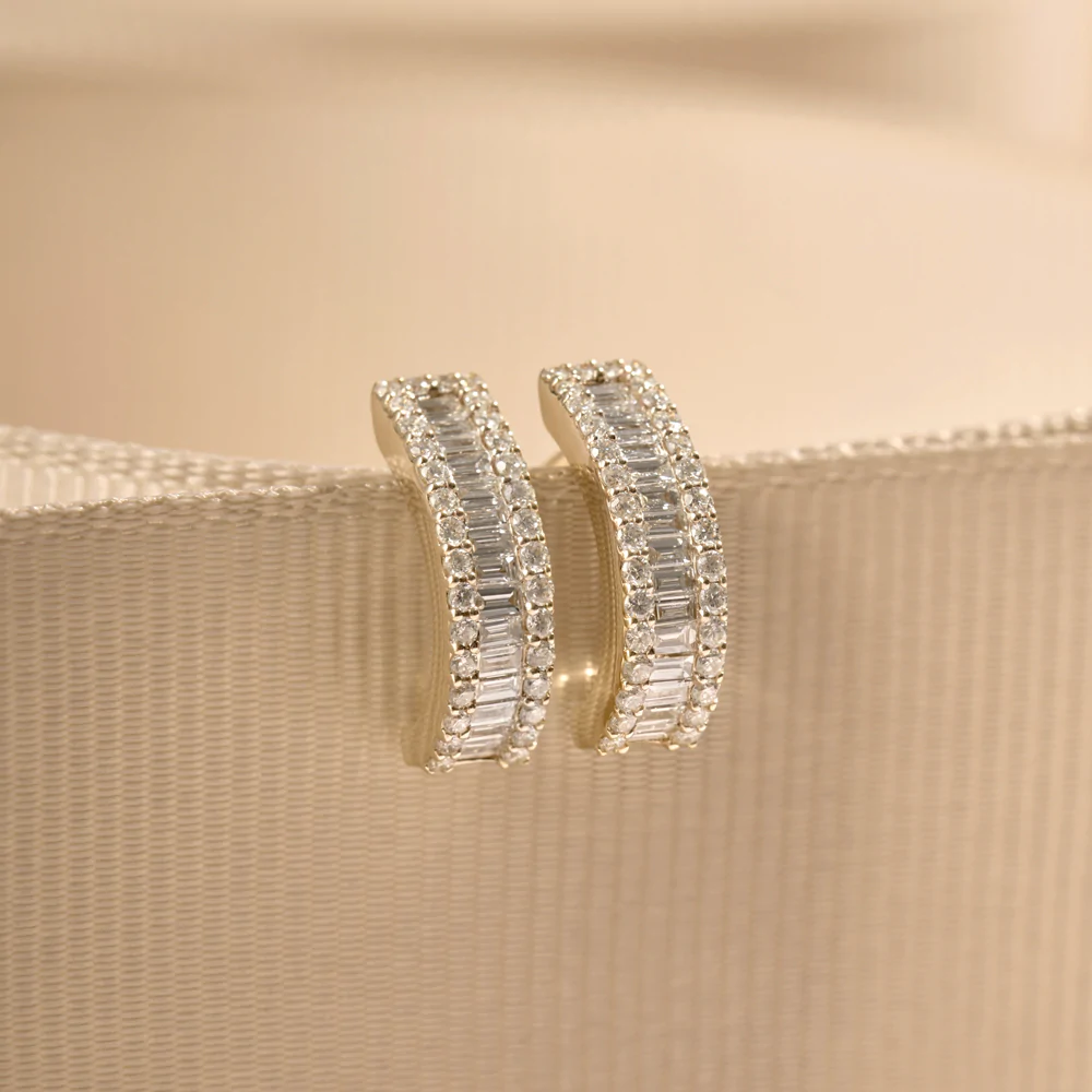Made from the finest 14K gold, these earrings have a perfect blend of round and baguette Natural diamonds in a micro pave setting. These earrings have a total carat weight of 0.75 ctw and are designed to shimmer and shine, adding that touch of elegance to any outfit.