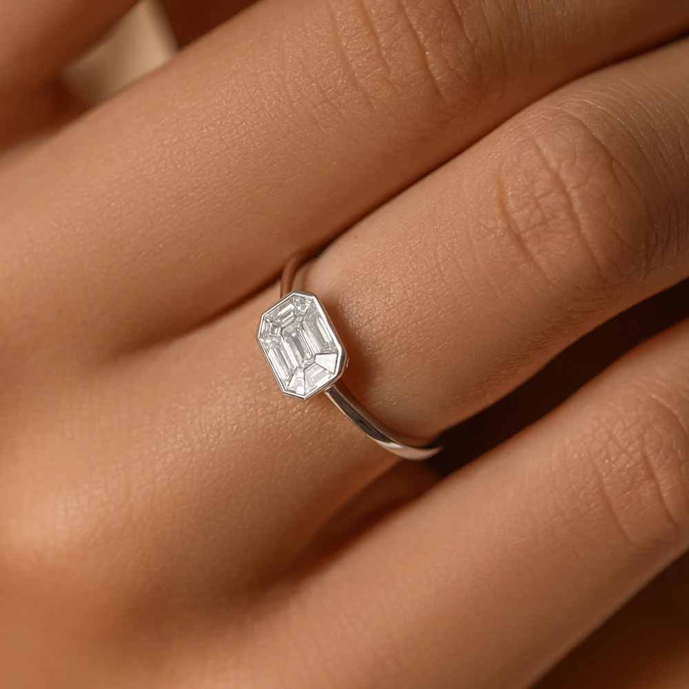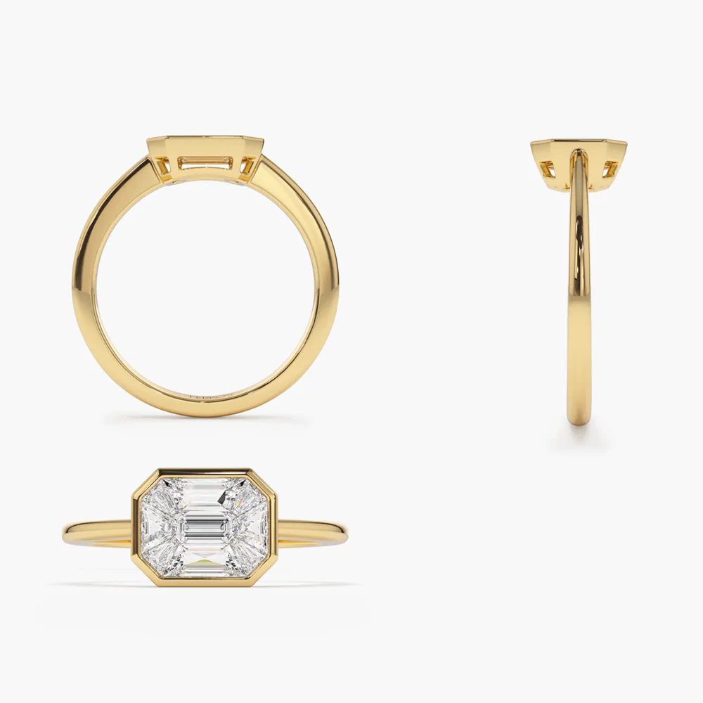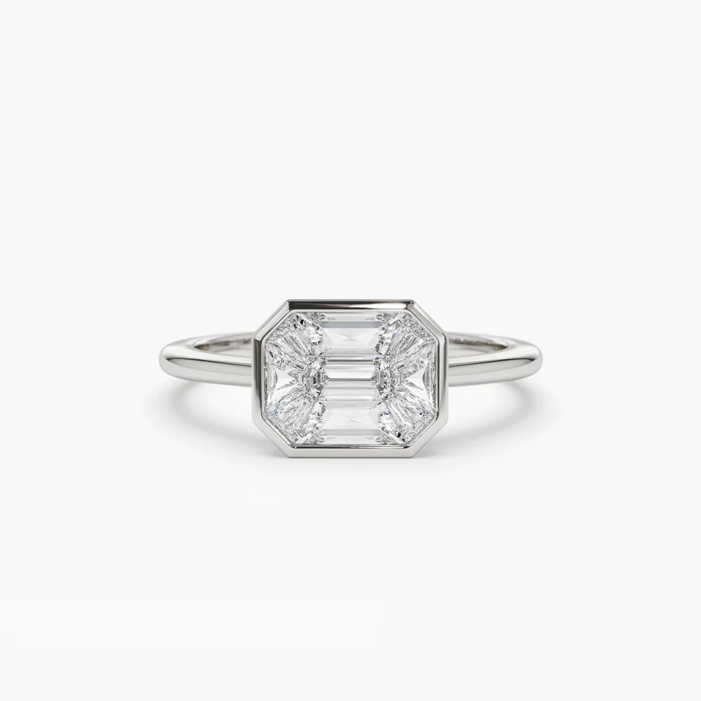 “Elegant 14K Solid Gold East West Illusion Setting Emerald Pie Cut Diamond Engagement Ring – a stunning design with a unique emerald pie cut diamond in an illusion setting.”