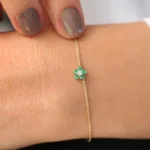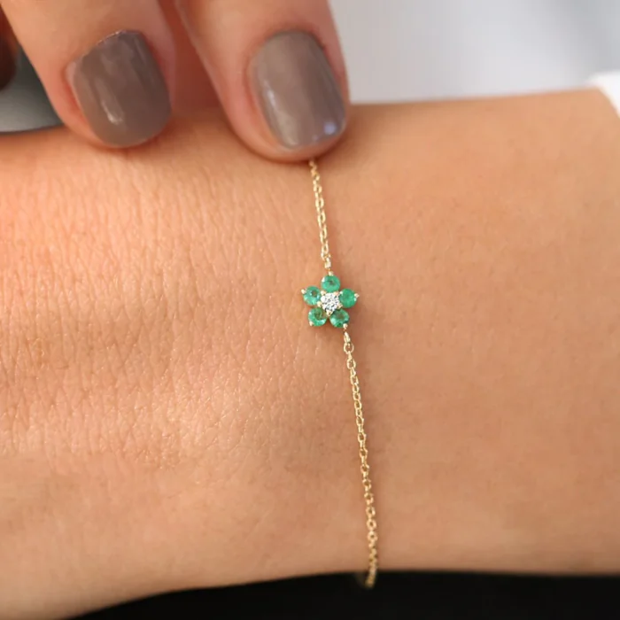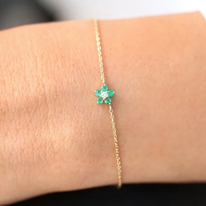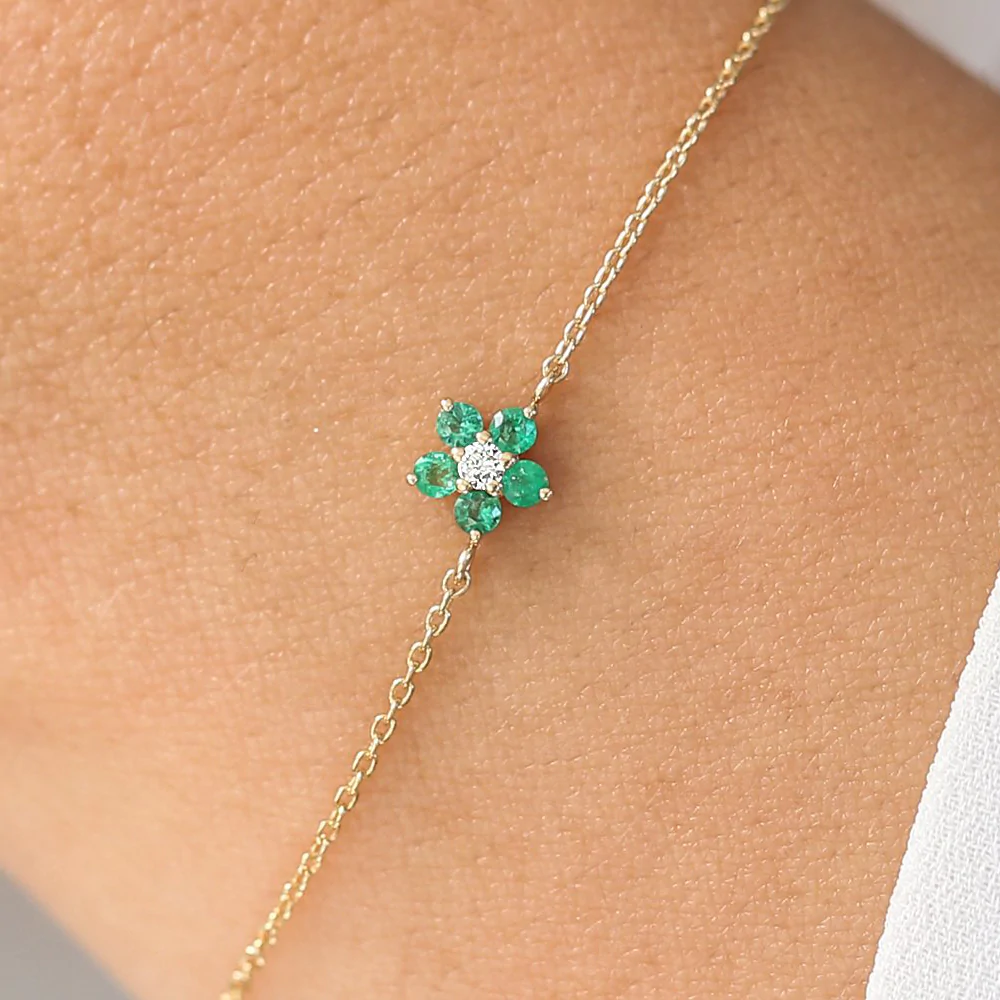 Charming 14K solid gold bracelet featuring an emerald and diamond flower charm—crafted for timeless elegance and a delicate floral touch.