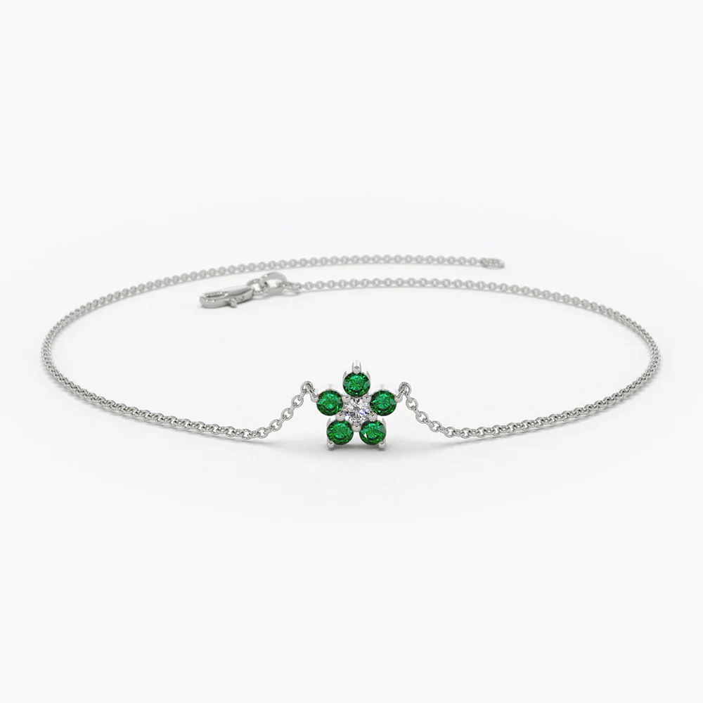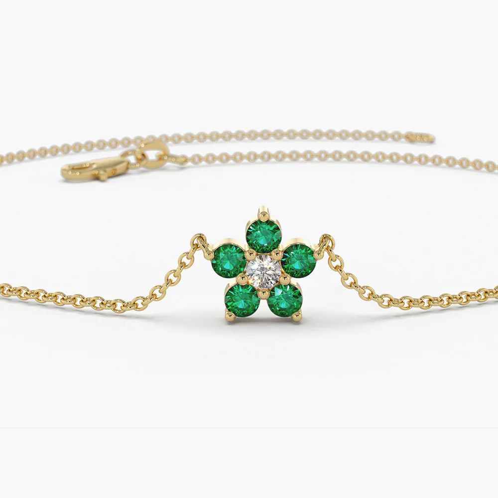 Elevate your accessory collection with the 14K Solid Gold Emerald and Diamond Flower Charm Bracelet. This beautiful piece is made from premium 14K gold, featuring a lovely floral design that boasts five round emeralds, each measuring 1.75 MM, and a sparkling round diamond at the center, sized 2.00 MM. The vibrant green of the emeralds perfectly complements the brilliance of the diamond, making this bracelet a true statement piece.
