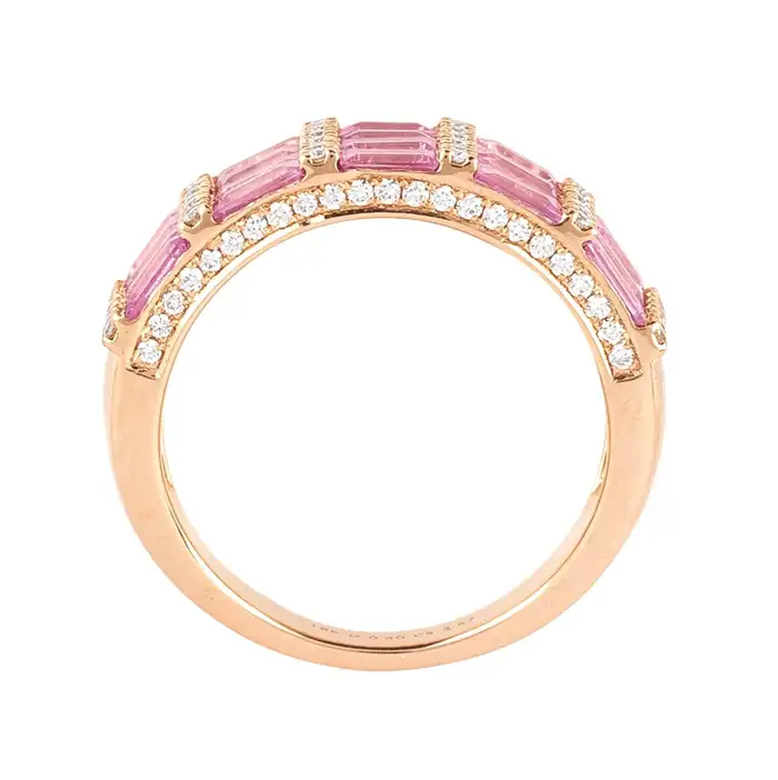 This gorgeous half eternity ring boasts 2.51 carats of beautiful pink sapphires complemented by diamonds weighing 0.40 carats. Colorful sapphires paired with sparkling diamonds make a stunning piece that shines with brilliance at every angle. This is a great piece for celebrating engagement, birthdays, or simply just because it is an expression of love and is vintage-inspired for years to come.