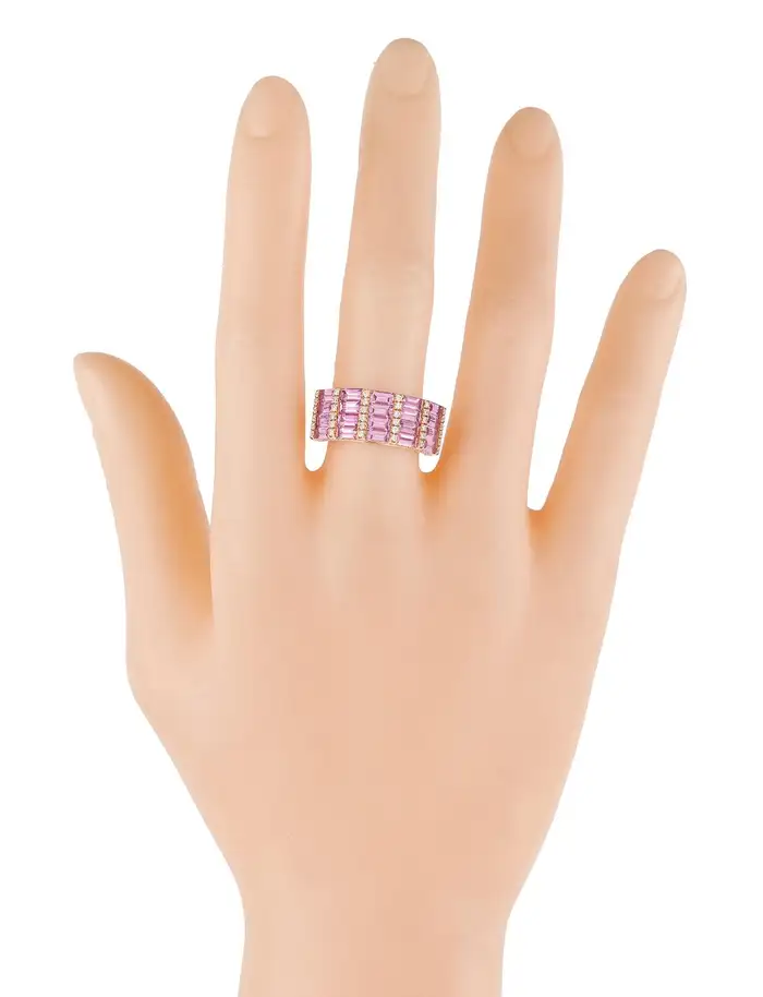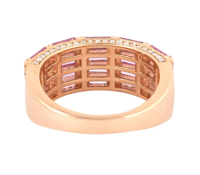 It is made from solid 14K gold, available in white, rose, and yellow gold, so it can be customized to suit any style. The intricate design and the vibrant pink sapphires give it a romantic feel, making it perfect for special occasions or everyday wear.