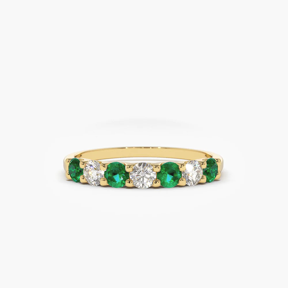 A beautiful 14K solid gold wedding band featuring alternating emeralds and diamonds, offering a timeless and elegant design perfect for a special day.