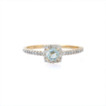 At the heart of this exquisite ring is a single, round-cut aquamarine gemstone weighing 0.26 carats. Measuring 4.1 mm, the aquamarine’s captivating blue hue symbolizes tranquility and harmony, making it an ideal gemstone for those who appreciate the beauty of nature. The round cut of the gemstone maximizes its brilliance, ensuring that it sparkles beautifully with every movement.