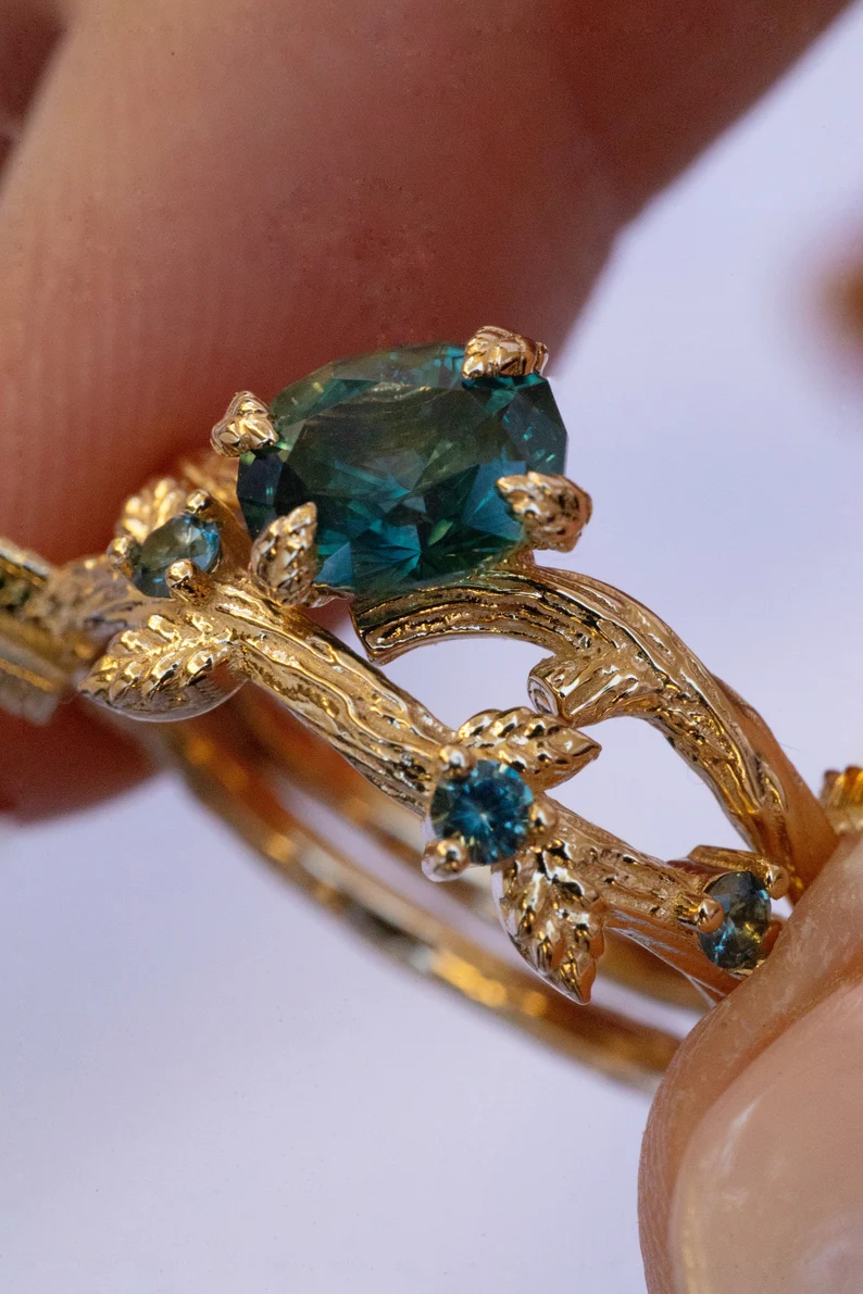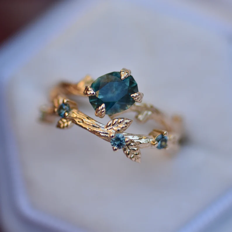Be the first to review “14K Solid Gold Blue-Green Montana Sapphire Leaf Engagement Ring Set” Cancel reply