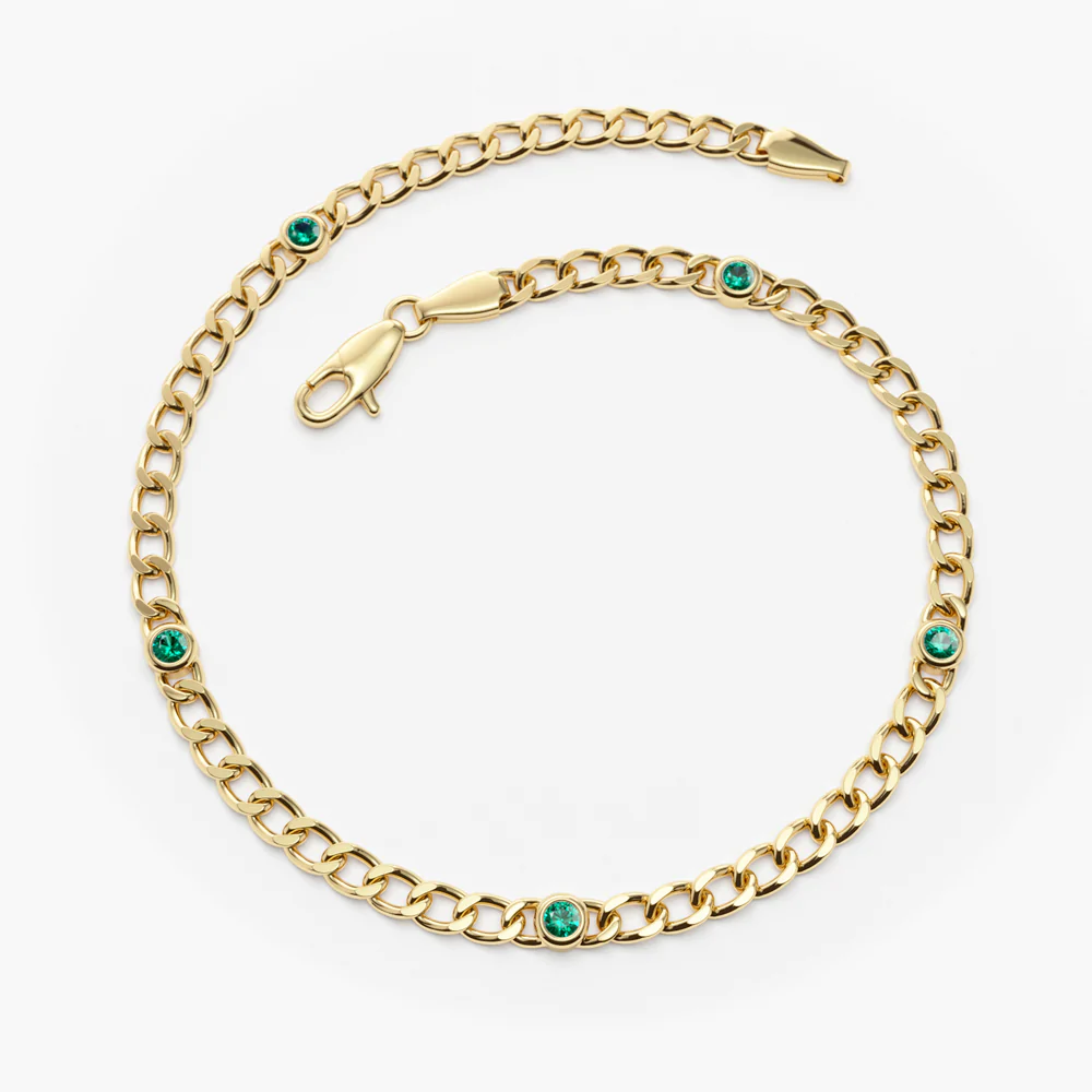 14K Solid Gold Cuban Link Bracelet with Bezel Setting Emerald