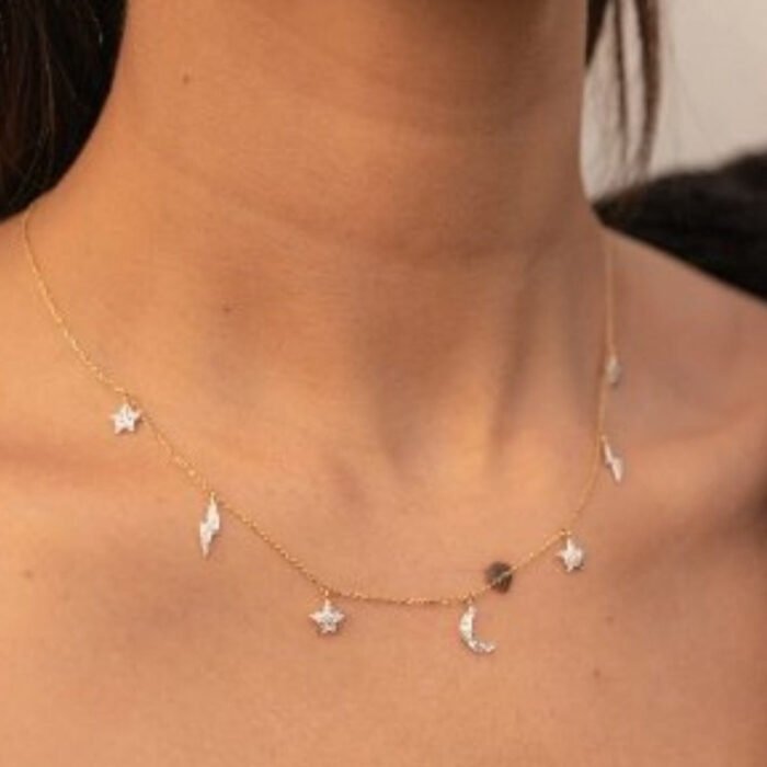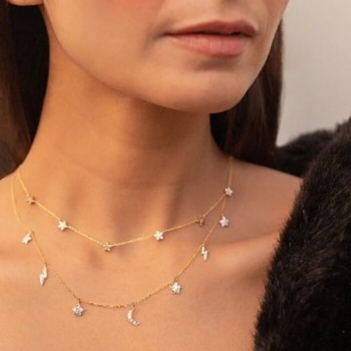 Dainty Diamond Station Necklace: Delicate and elegant, this handmade solid gold necklace features a chain adorned with sparkling natural diamonds, offering understated luxury for everyday wear or special occasions.