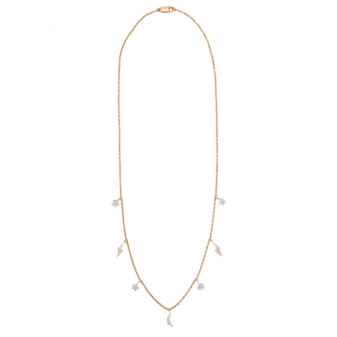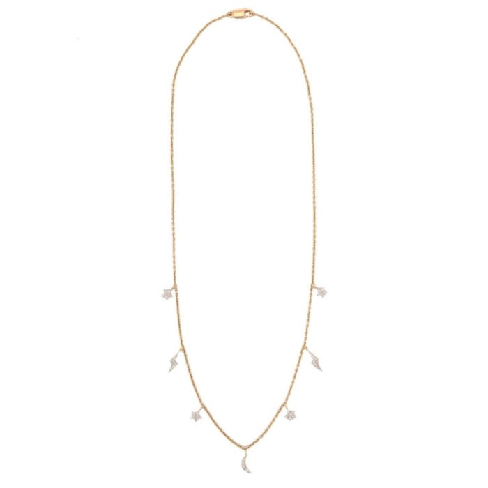 The diamonds are meticulously set to create a continuous shimmering effect, enhancing the necklace’s brilliance and glamour. The 14K yellow gold setting provides a luxurious backdrop, adding warmth and sophistication to the piece.