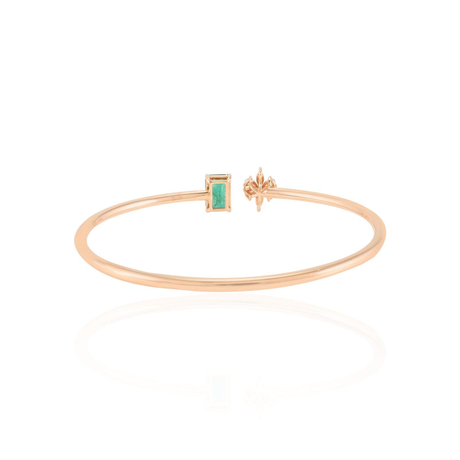 The 14K Solid Gold Emerald Diamond Cuff Bracelet is a luxurious and versatile piece of jewelry that exudes sophistication. Crafted from 14KÂ gold, this cuff bracelet features a stunning 1.31 carat octagon-shaped emerald, measuring 8.63 x 5.87 mm. The rich green hue of the emerald is complemented by 0.37 carats of sparkling diamonds, strategically placed to enhance the bracelet’s elegance. With a gross weight of 6.32 grams, the bracelet is both substantial and comfortable to wear. The adjustable length ensures a perfect fit for any wrist size, while the 10.3 mm width provides a bold yet refined look. The combination of emerald and diamonds in a rose gold setting creates a timeless piece that can be worn for both casual and formal occasions. The 14K Gold Emerald Diamond Cuff Bracelet is a testament to fine craftsmanship and the enduring beauty of gemstones. It makes a perfect gift for a loved one or a cherished addition to your own jewelry collection, offering a blend of elegance, luxury, and versatility that is sure to impress.