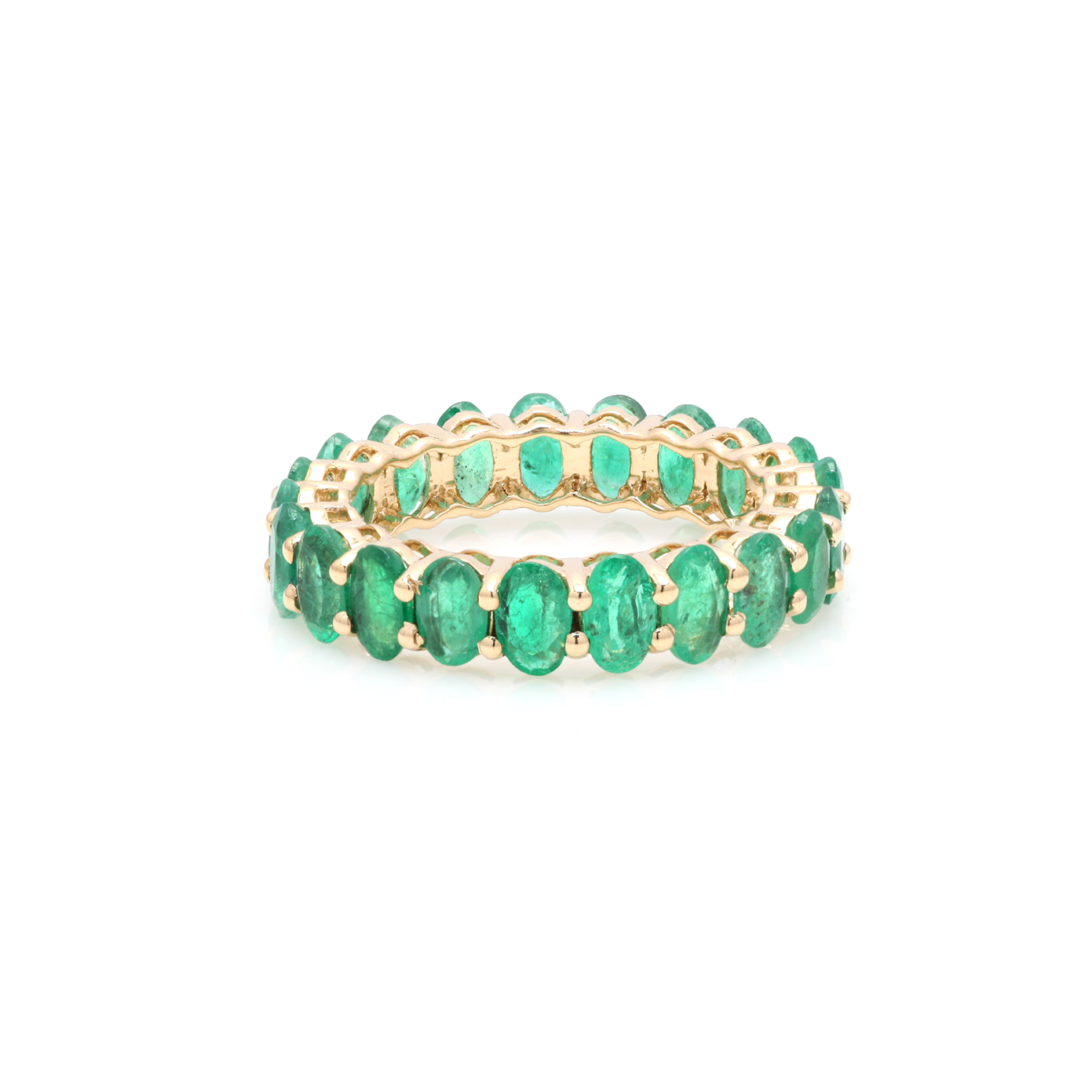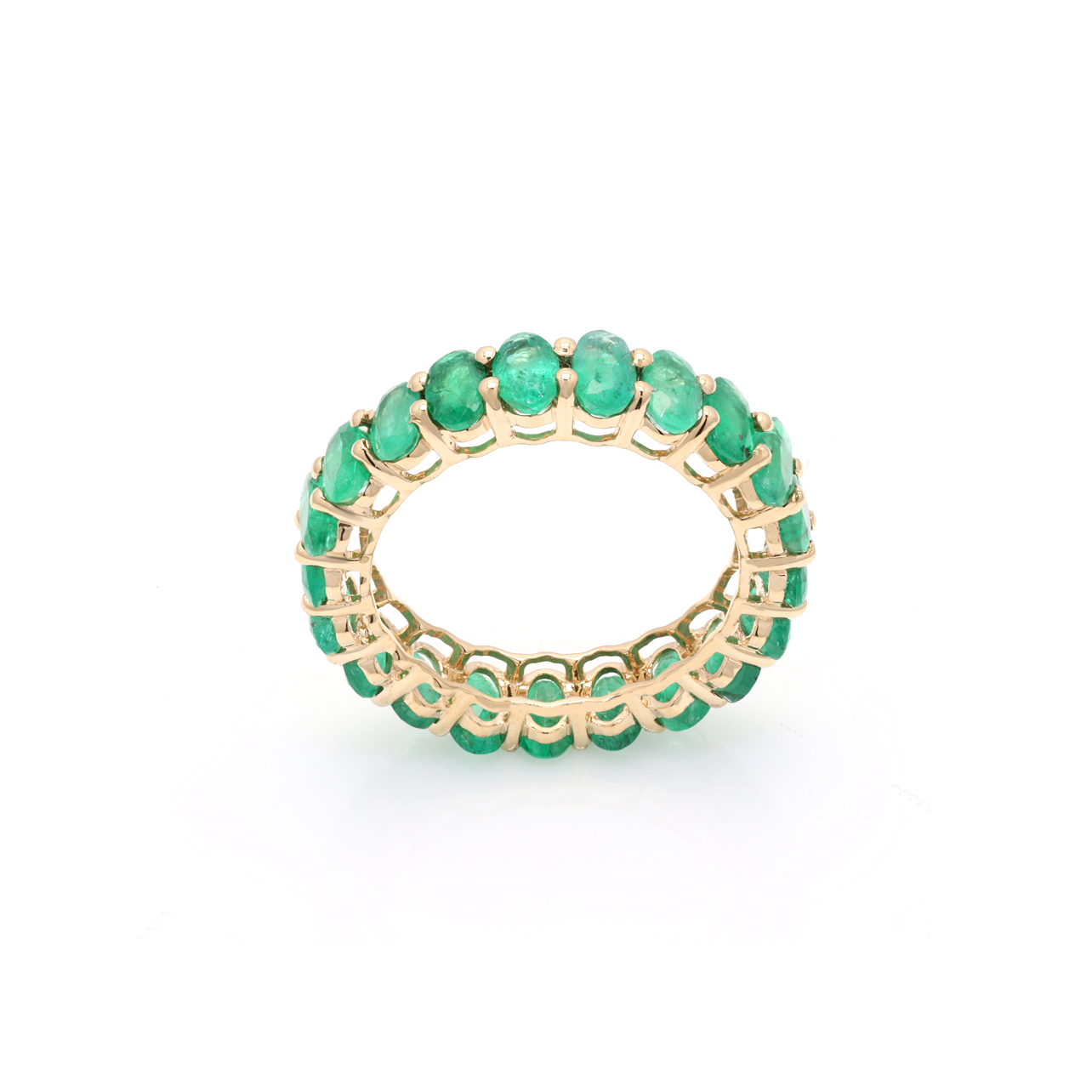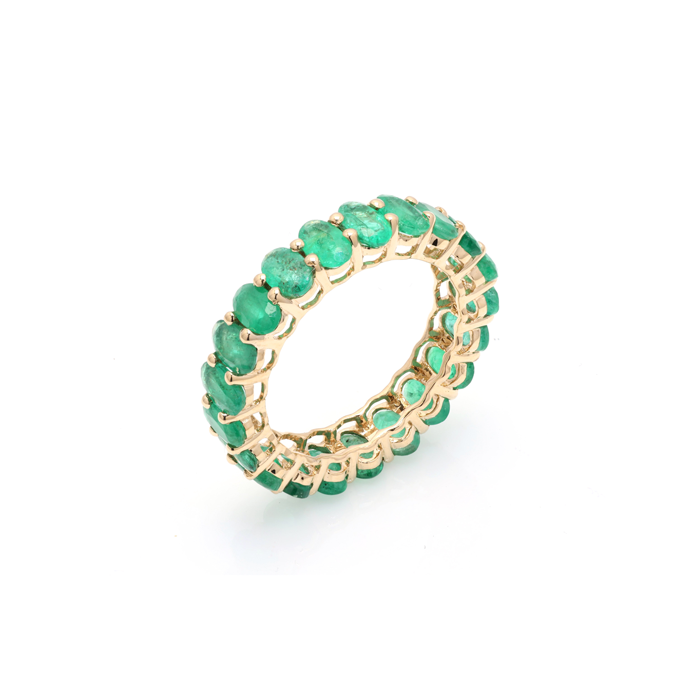 Timeless 14K solid gold eternity band featuring a full circle of vivid emeralds—crafted for lasting elegance, rich color, and symbolic beauty.