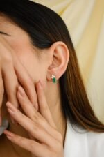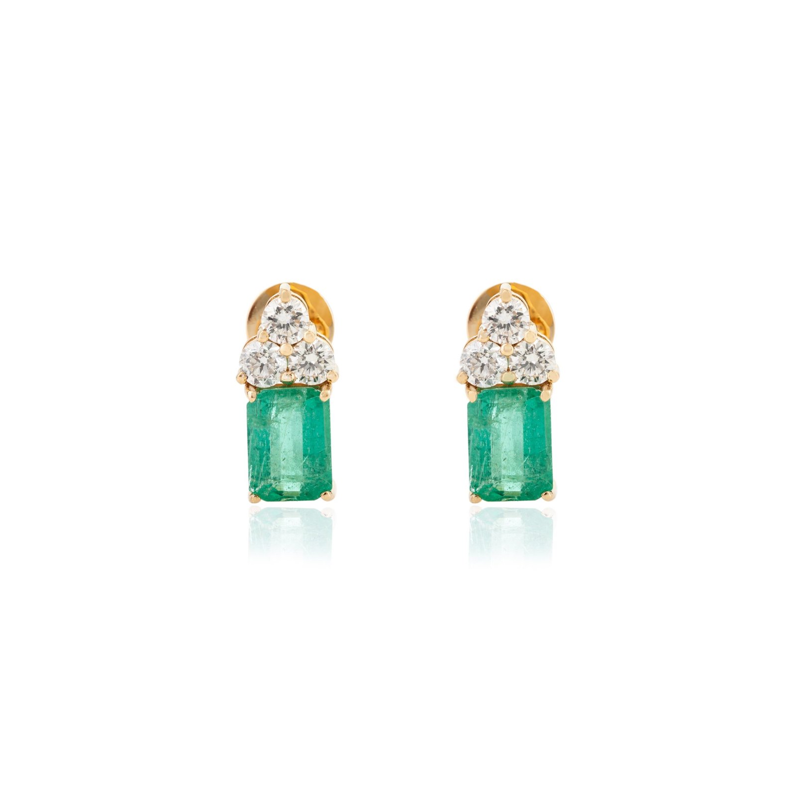 These 14K solid gold stud earrings feature vibrant emeralds paired with three dazzling diamonds, offering a refined touch of luxury and timeless charm.
