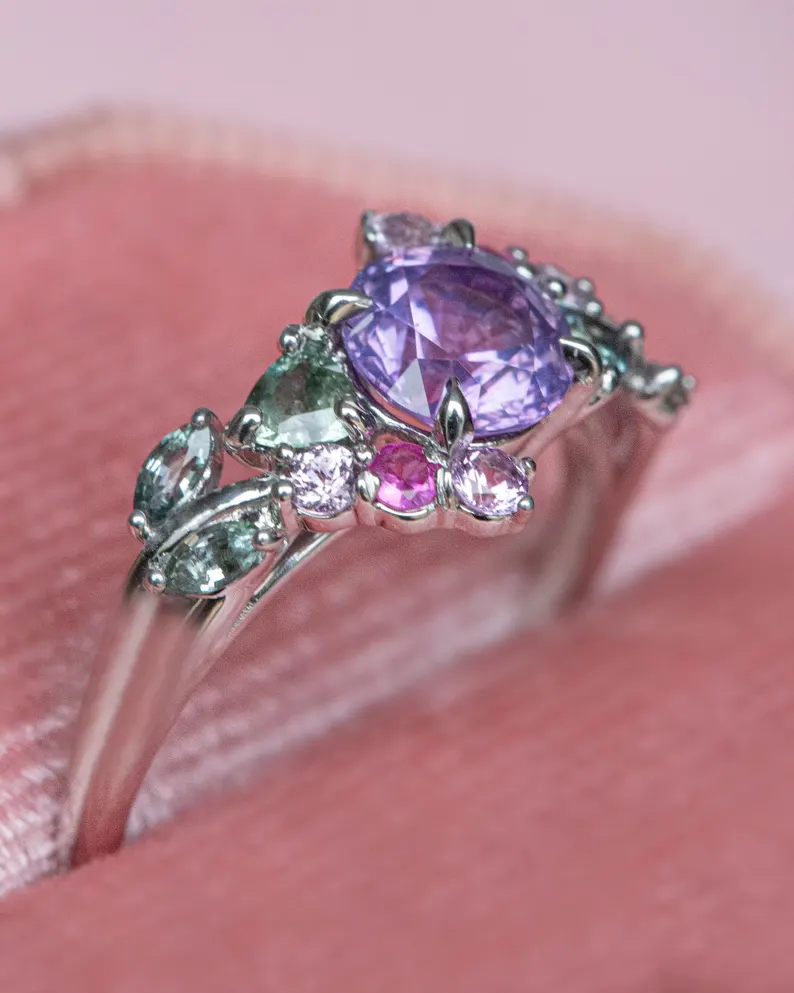 Step into a fairytale with the 14K Solid Gold Enchanted Garden Purple Sapphire Ring — a piece that captures the whimsy and romance of nature in full bloom. At the heart of this dreamy design lies a natural purple sapphire, known for its ethereal hue that ranges from soft lavender to deep violet. The sapphire is surrounded by a delicate arrangement of gold vines, tiny leaves, and floral-inspired accents, creating a garden-like setting that feels both magical and timeless.