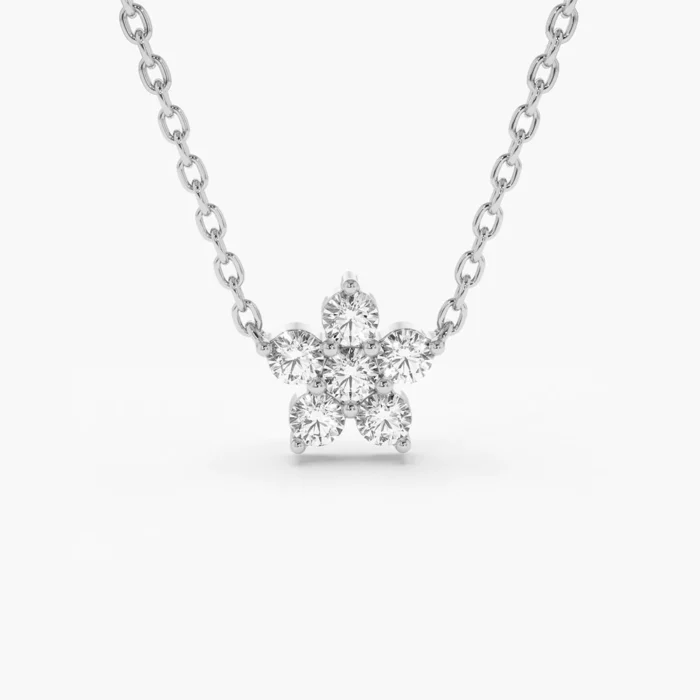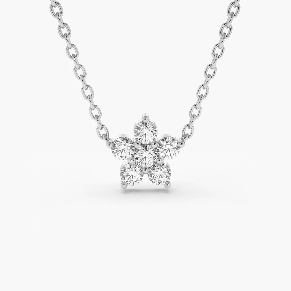 The 14K Gold Flower Charm Natural Diamond Necklace features 6 prong-set diamonds totaling 0.18 ct, with a charming flower design. Available in white, rose, and yellow gold, this necklace is BIS Hallmarked and ships within 10-12 business days. Live chat and video call support available.