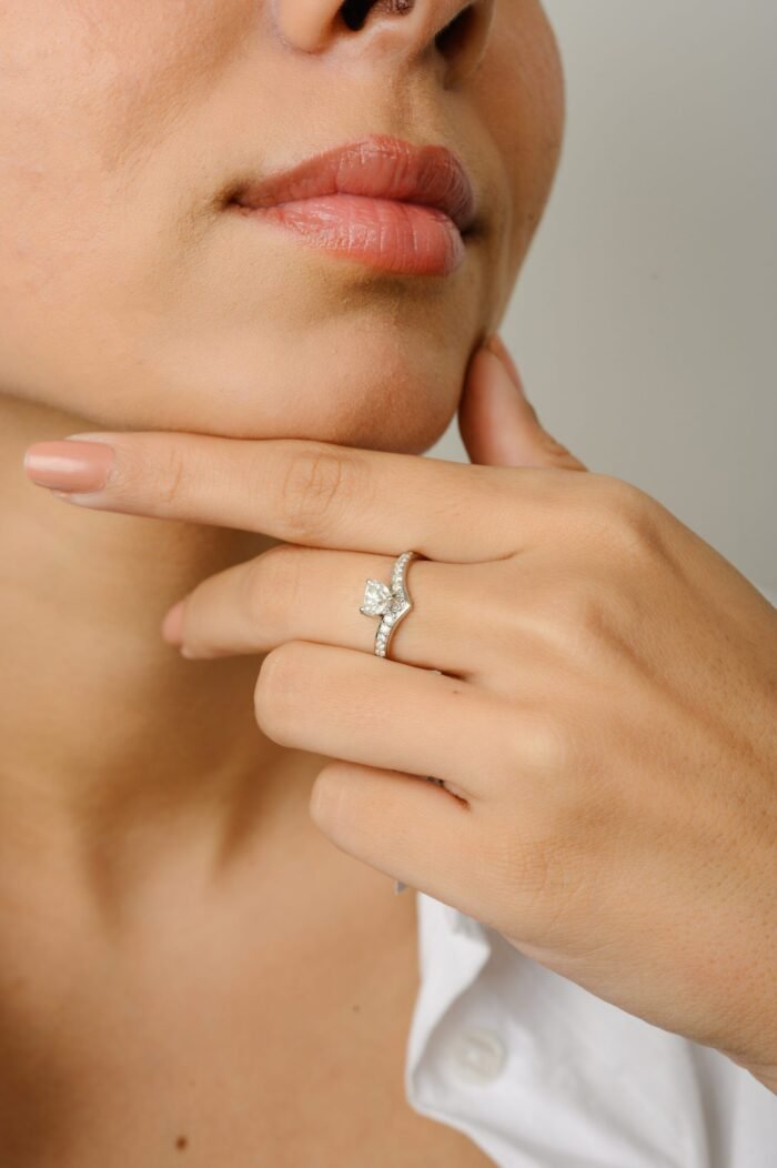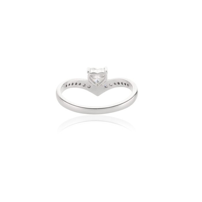 Weighing 2.1 grams, this chevron ring offers a lightweight yet luxurious feel, making it ideal for everyday wear or special occasions. The shank, measuring 1.7 mm in width, provides a delicate and refined appearance that sits gracefully on the finger. The elegant design ensures that the heart-shaped diamond remains the focal point, allowing its beauty to shine through.
