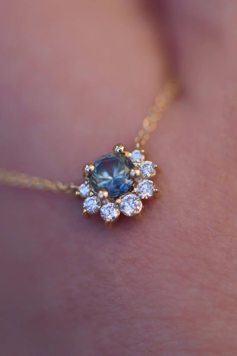 Montana Sapphire and Diamond Floral Necklace featuring a 4.5 mm sapphire and natural diamonds (1/6 ct), set in solid 14K gold. GIA & BIS Hallmarked.