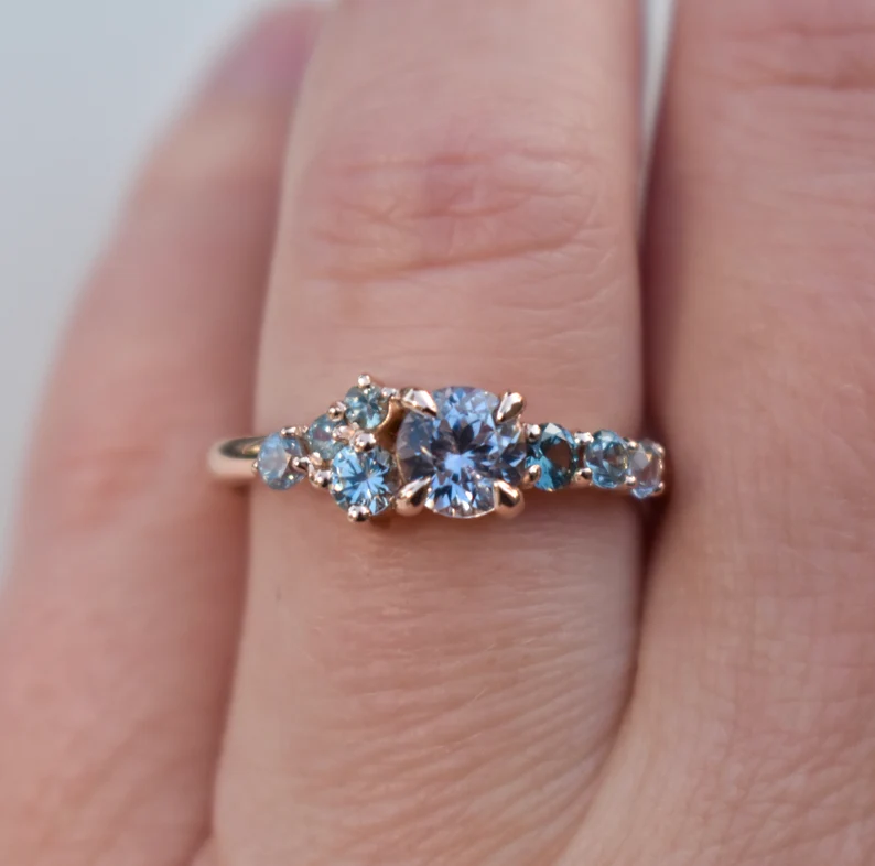 Romantic 14K solid gold engagement ring featuring a cluster of Montana sapphires—crafted for natural elegance and timeless sophistication.