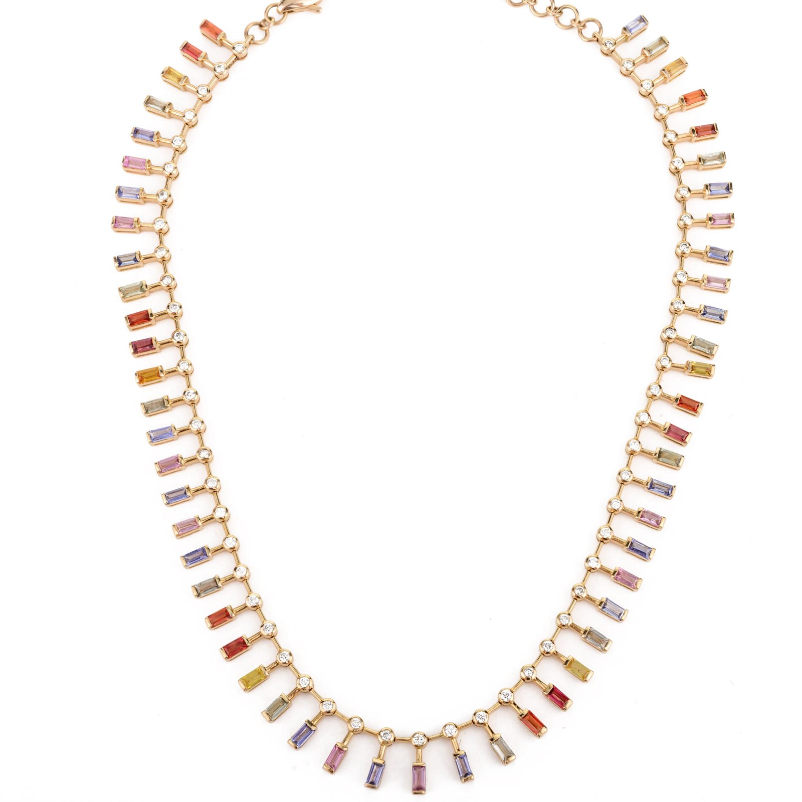 The 14K Solid Gold Multi Sapphire Choker Necklace is a breathtaking piece that elegantly combines the vibrant allure of multi-colored sapphires with the timeless sparkle of diamonds. Crafted from 14K solid gold, this necklace features 55 exquisite baguette-cut sapphires, each measuring 5 x 2.2 mm, with a total gemstone weight of 8.04 carats. The rich array of colors in the sapphires is beautifully complemented by the warm tones of the yellow gold, creating a harmonious and captivating look.