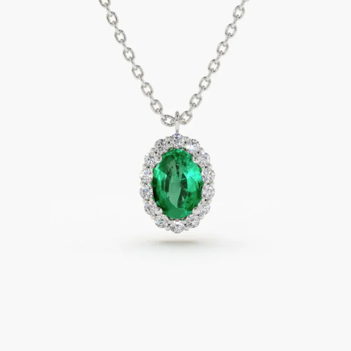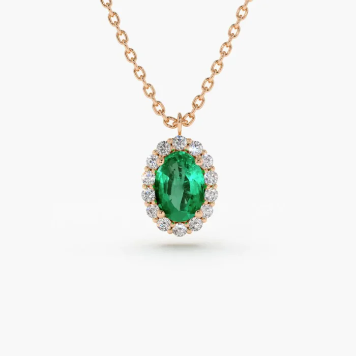 The 14K Solid Gold Oval Cut Emerald Halo Diamond Necklace will radiate a kind of elegance that time cannot age away.