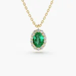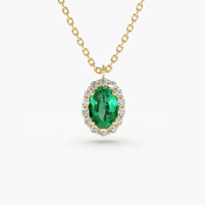 Elegant 14K solid gold necklace featuring an oval-cut emerald surrounded by a halo of diamonds—crafted for timeless luxury and vibrant sparkle.