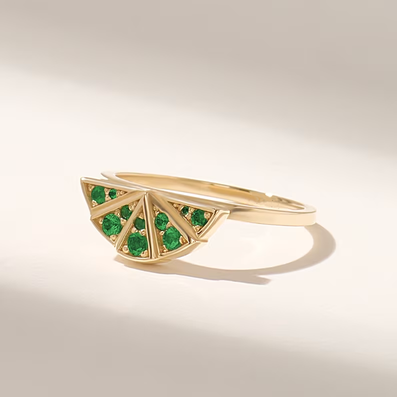 Chic 14K solid gold boho ring with pavé-set emeralds—crafted for free-spirited elegance, vibrant color, and a touch of modern charm.